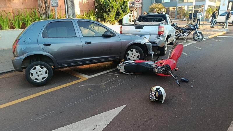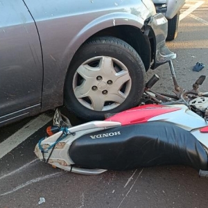 Um acidente envolvendo dois automóveis e uma motocicleta foi registrado por volta das 7h40 da manhã desta quinta-feira (3) na Rua Sarandi, região central de Toledo. A colisão resultou em uma mulher ferida e mobilizou equipes do Corpo de Bombeiros e da Polícia Militar.