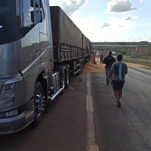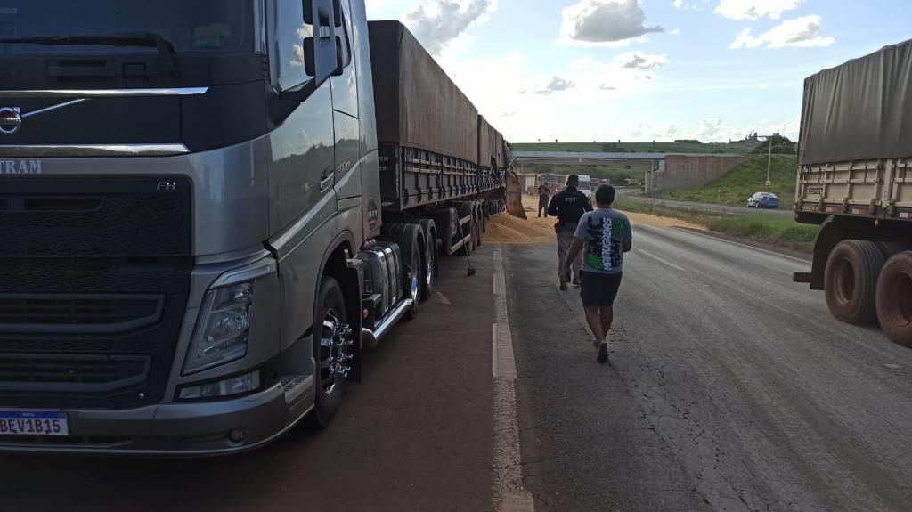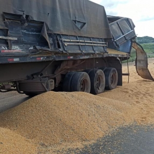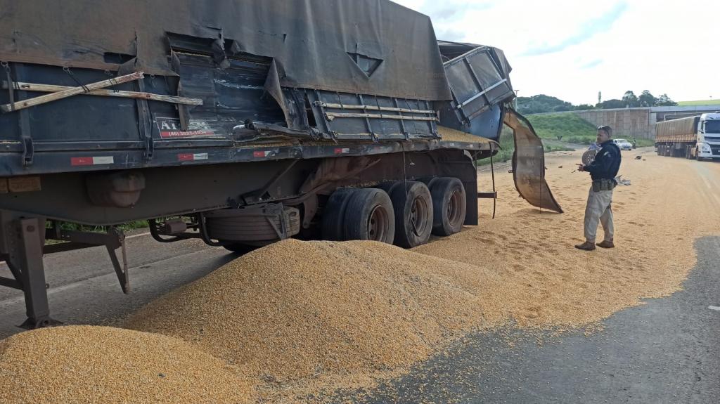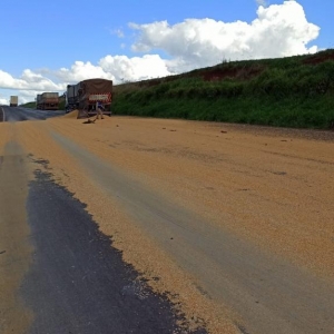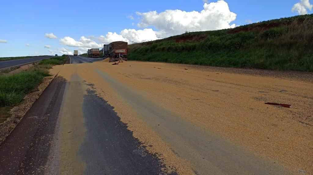 Parte da carga de milho ficou espalhada no asfalto, a pista sentido a Toledo ficou parcialmente interditada.