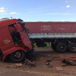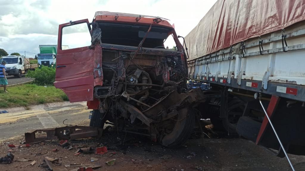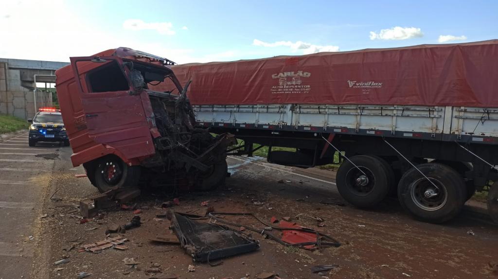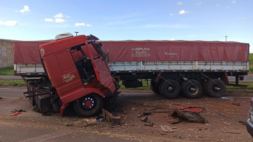 O condutor perdeu o controle da carreta e atravessou o canteiro central da rodovia e atingiu a outra carreta que seguia no sentido contrário.