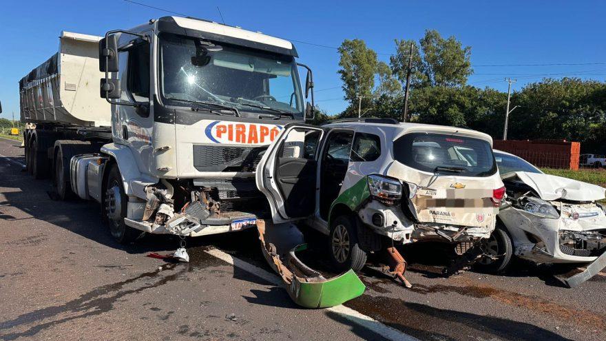 Com o impacto, o trânsito na rodovia federal ficou parcialmente interrompido, provocando lentidão e formação de congestionamento no sentido Mandaguaçu–Maringá. Em razão do fluxo travado, um caminhão que seguia pela via acabou colidindo com veículos que estavam parados, dando início a um engavetamento envolvendo seis veículos — sendo um caminhão, uma motocicleta, um veículo da Secretaria de Saúde de Nova Esperança e outros três carros de passeio.