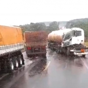 Um dos caminhões é de transporte de combustível.