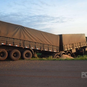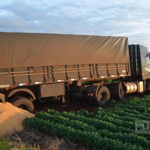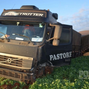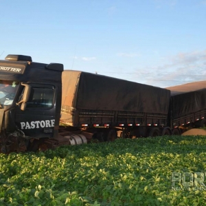 Depois da batida o motorista da carreta perdeu o controle, atravessou a BR e foi parar dentro de uma plantação de soja.