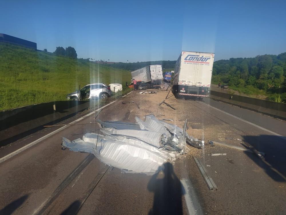 Um acidente entre carros e caminhões interdita totalmente a BR-277, em Balsa Nova, na Região Metropolitana de Curitiba (RMC), na manhã desta terça-feira (30).