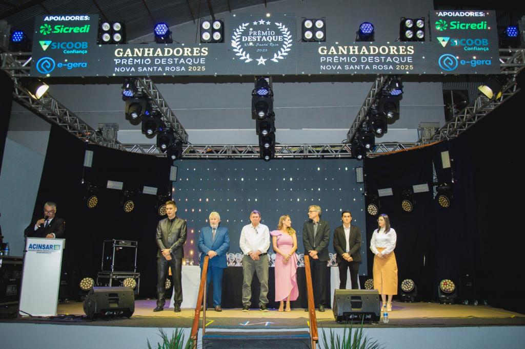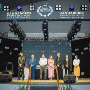 Em um evento realizado no último dia 08, no Centro de Eventos Joia do Oeste, foram conhecidos os vencedores do 3º Prêmio Destaque Nova Santa Rosa 2025, os quais, junto de seus convidados, celebraram o reconhecimento recebido em uma noite especial. Foram premiados, na oportunidade, empresas e profissionais em 97 categorias, os quais se destacaram em suas atividades ao longo deste ano.