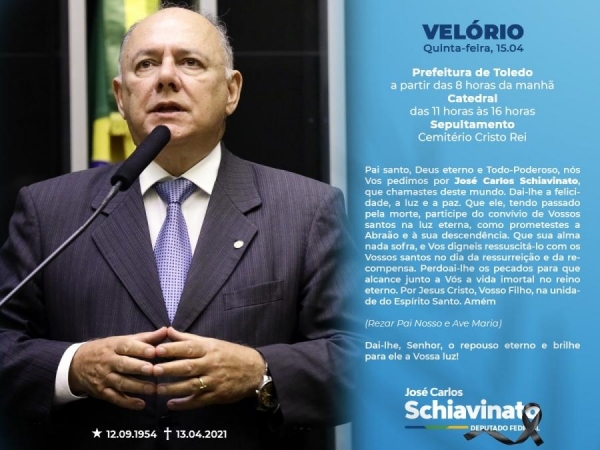 O velório de José Carlos Schiavinato acontecerá nesta quinta-feira (15), a partir das 8 horas manhã na Prefeitura de Toledo.