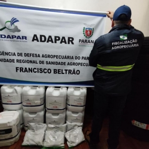 Em fiscalização coordenada pela ADAPAR, na primeira semana de atividade, os fiscais de Defesa Agropecuária da ADAPAR realizaram a apreensão no sudoeste do Paraná de 1000 litros de agrotóxicos de origem estrangeira e de utilização proibida no território brasileiro, bem como 1500 gramas de agrotóxicos sem cadastros nos órgãos de defesa agropecuária nacional e estadual.