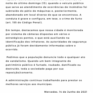 “A Administração Pública do Município de Mercedes repudia veementemente o lastimável fato ocorrido na noite do último domingo (13), quando o veículo público que serve ao atendimento de ocorrências de incêndios foi subtraído do pátio de máquinas e, posteriormente, abandonado em local diverso do que se encontrava. A conduta é grave e configura, em tese, o crime de furto (art. 155 do Código Penal).