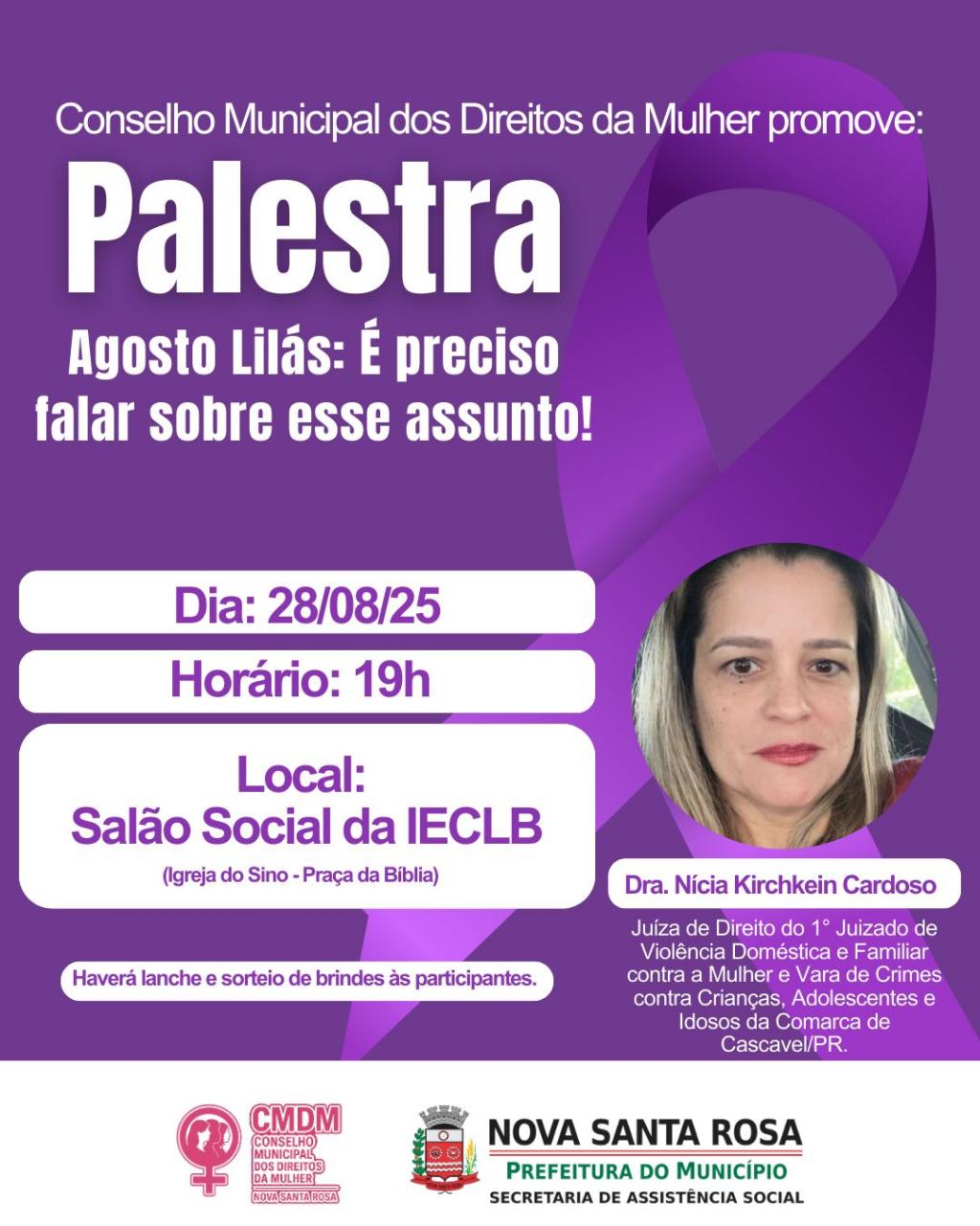 O Conselho Municipal dos Direitos da Mulher, em parceria com a Prefeitura de Nova Santa Rosa, por meio da Secretaria de Assistência Social, realizará na quinta-feira (28), às 19h, a palestra “Agosto Lilás: É preciso falar sobre esse assunto”, no Salão Social da IECLB – Igreja do Sino (Praça da Bíblia).
