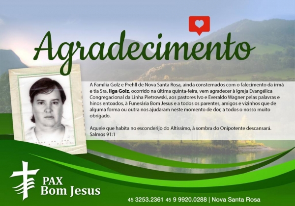 A Família Golz e Prehll de Nova Santa Rosa, ainda consternados com o falecimento da irmã e tia Sra. Ilga Golz, ocorrido na última quinta-feira, vem agradecer à Igreja Evangélica Congregacional da Linha Pietrowski, aos pastores Ivo e Everaldo Wagner pelas palavras e hinos entoados, à Funerária Bom Jesus e a todos os parentes, amigos e vizinhos que de alguma forma ou outra nos ajudaram neste momento de dor, a todos o nosso muito obrigado.
