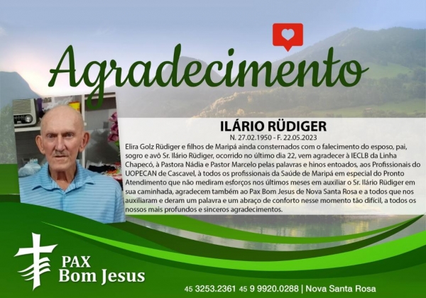 Elira Golz Rüdiger e filhos de Maripá ainda consternados com o falecimento do esposo, pai, sogro e avô Sr. Ilário Rüdiger, ocorrido no último dia 22, vem agradecer à IECLB da Linha Chapecó, à Pastora Nádia e Pastor Marcelo pelas palavras e hinos entoados, aos Profissionais do UOPECAN de Cascavel, à todos os profissionais da Saúde de Maripá em especial do Pronto Atendimento que não mediram esforços nos últimos meses em auxiliar o Sr. Ilário Rüdiger em sua caminhada, agradecem também ao Pax Bom Jesus de Nova Santa Rosa e a todos que nos auxiliaram e deram um palavra e um abraço de conforto nesse momento tão difícil, a todos os nossos mais profundos e sinceros agradecimentos.