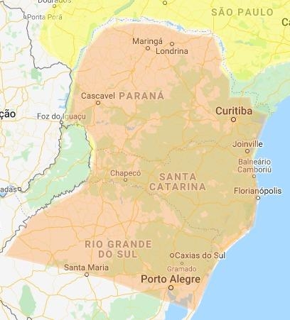Região Metropolitana de Curitiba, região central, litoral, norte, oeste, sudoeste e sul do Paraná, oeste Catarinense, Vale do Itajai, Grande Florianópolis, Planalto Sul Catarinense, Litoral Sul Catarinense, Depressão Central, Encosta inferior e superior do Nordeste, Campos de Cima da Serra, Planalto Médio, Missões, Alto Uruguai, , Litoral Gaúcho, Meio-Oeste Catarinense, Litoral Norte Catarinense e Planalto Norte Catarinense.