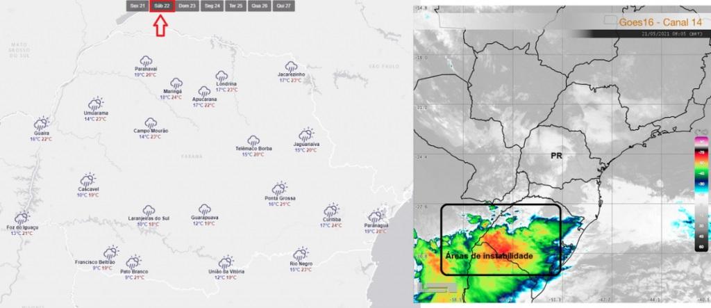 O alerta também é do Simepar que prevê risco de tempestades entre a noite desta sexta-feira (21) e a madrugada/manhã de sábado (22). Áreas de instabilidade já atuam mais ao sul, com expectativa de deslocamento em direção ao estado do Paraná.