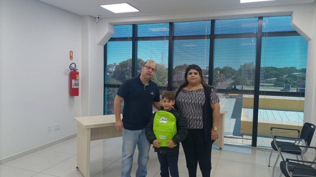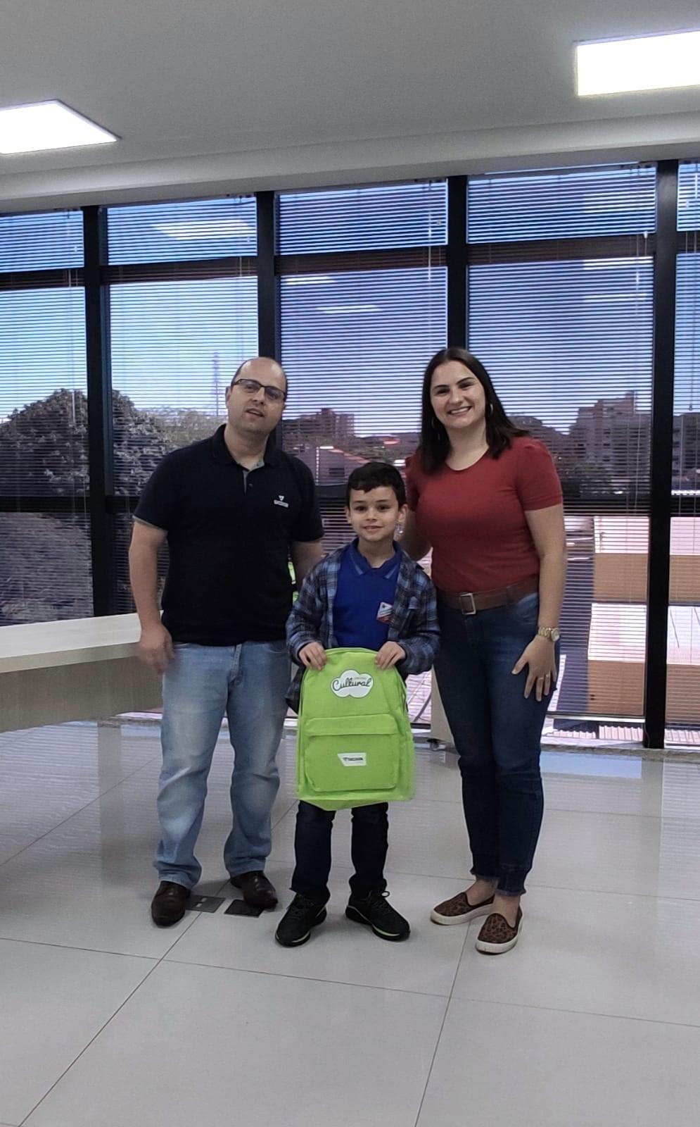 Escola Municipal Santa Terezinha: Mickael Duarte Rohde, 3º ano, da professora Lizandra Maria Schneider Schwartz, acompanhados da responsável pela Escola, Simone Patrícia Thiel.