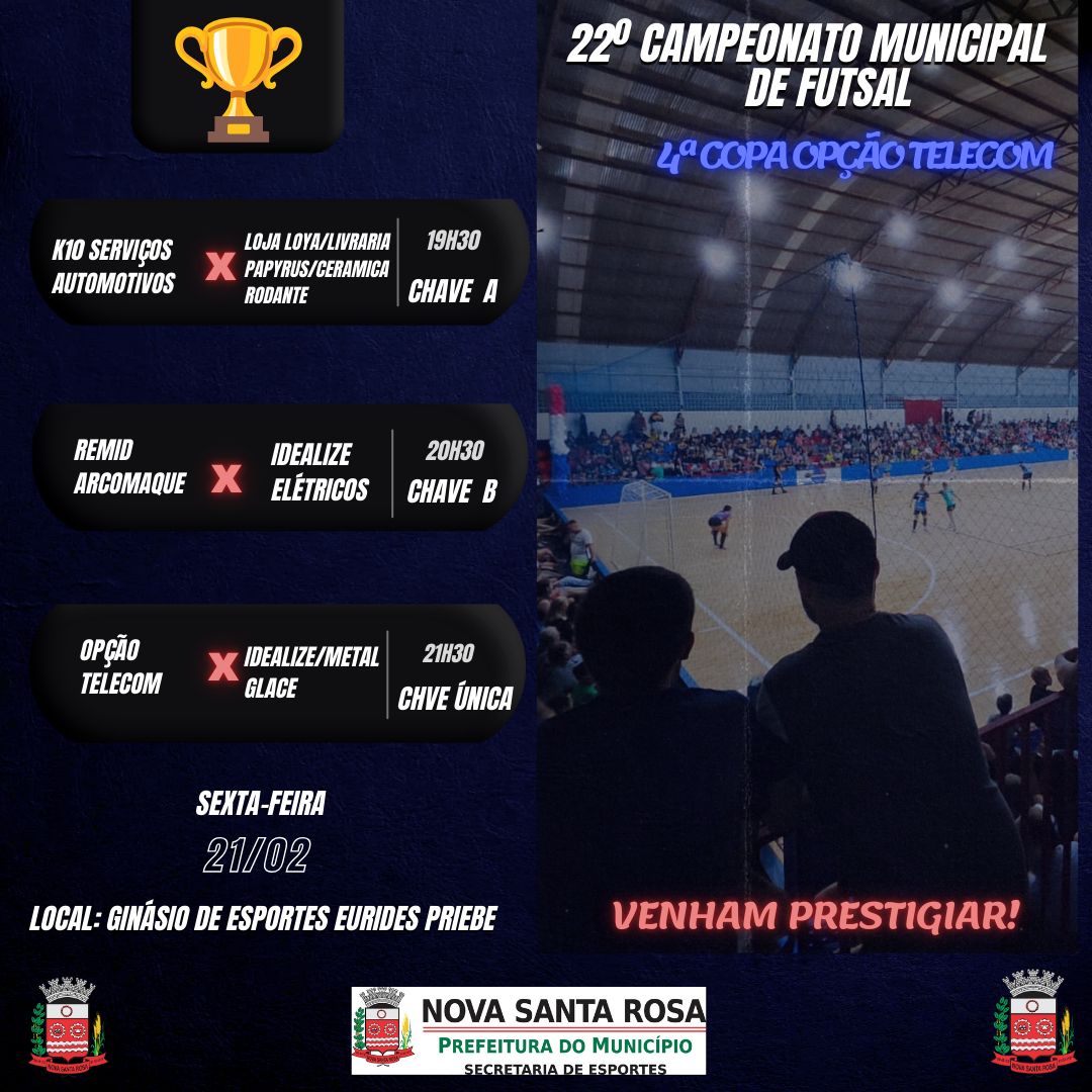 Amanhã, sexta-feira (21), é dia de 3ª rodada do Municipal de Futsal - 4ª Copa Opção Telecom.