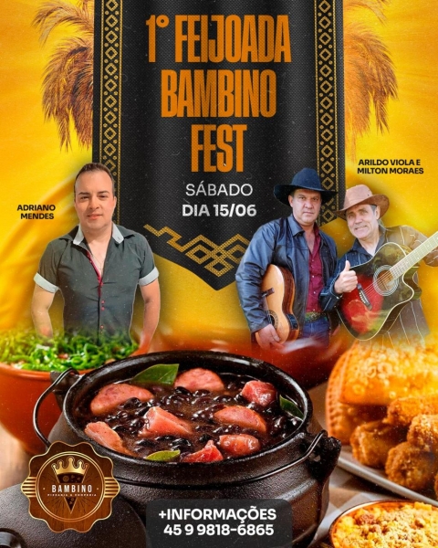 É neste sábado dia 15 de junho a 1ª Feijoada Bambino Fest a partir das 10h30 na Bambino Pizzaria e Choperia, presença confirmada de Arildo Viola e Milton Moares e Adriano Mendes.