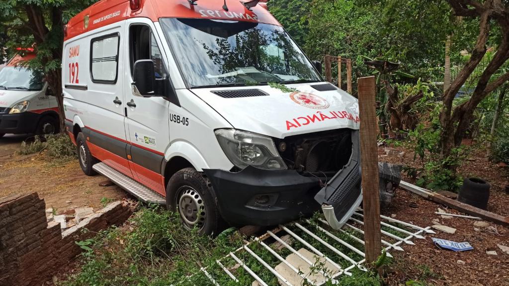 Após a colisão a ambulância desgovernada invadiu a calçada e atingiu o muro de uma residência parando parcialmente dentro do terreno.