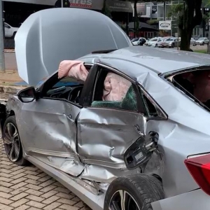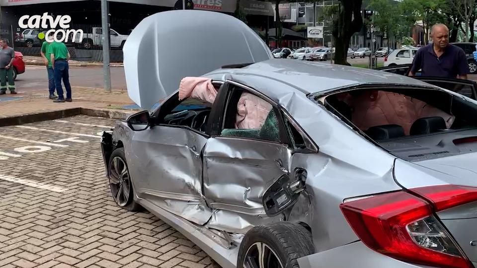 Com a força do impacto, o automóvel Honda Civic foi projetado até o estacionamento central da via, ficando destruído.