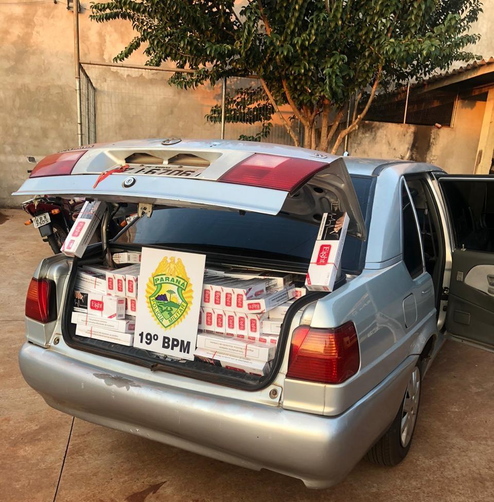 Ao retornar para realizar a abordagem, o indivíduo não foi localizado, próximo onde o indivíduo estava, havia estacionado um VW/Santana de cor prata e placas de Guaíra, com o vidro do motorista aberto. Após vistoria da equipe, foi constatado que o veículo estava carregado com cigarros. O veículo será entregue na Receita Federal de Cascavel.