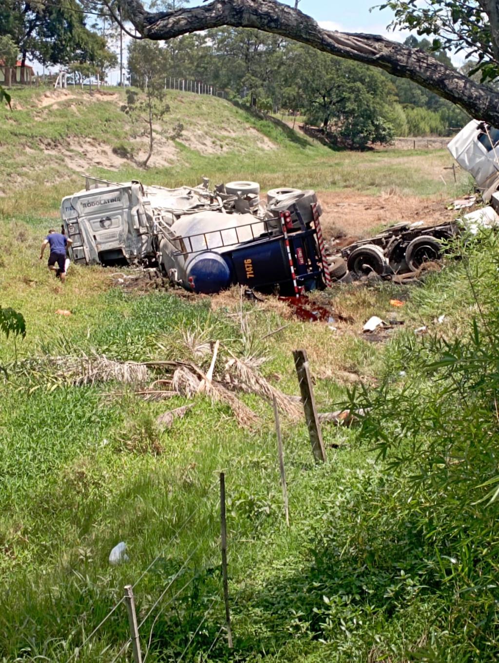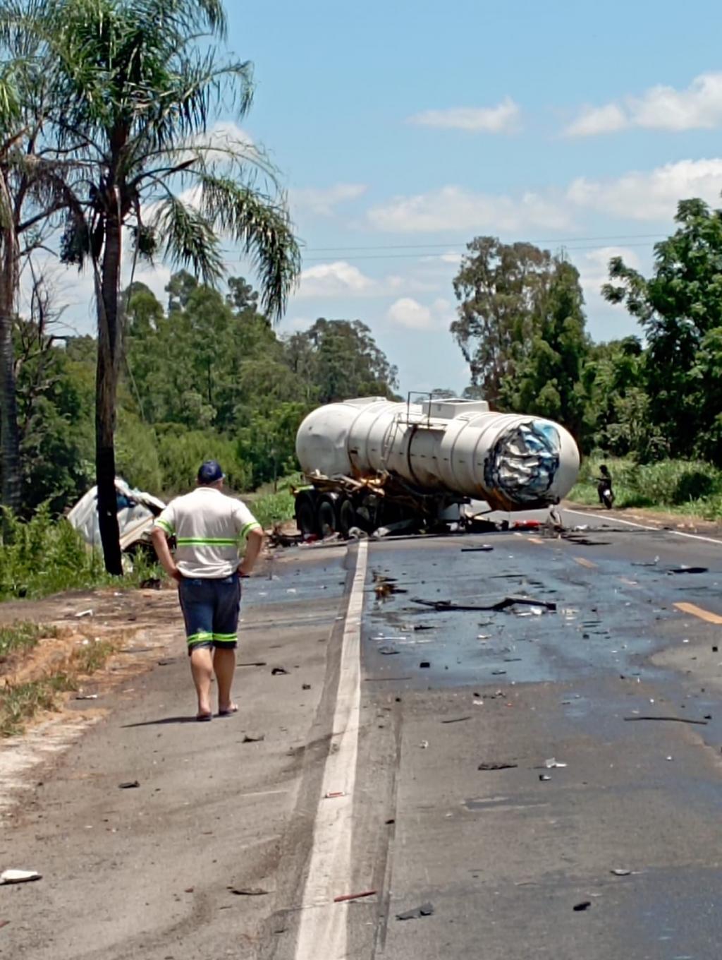 A violência do impacto foi tão grande que o cavalo mecânico da carreta de combustíveis foi arrancado e arrastado para fora da rodovia pela outra carreta e apenas os tanques ficaram sobre a rodovia.