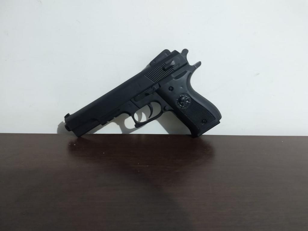 Ao realizar a busca pessoal foi localizado no lado direito da cintura do indivíduo uma pistola, que somente após ser retirada de seu shorts foi possível perceber que se tratava de um simulacro, continuada a busca nada mais de ilícito foi encontrado.