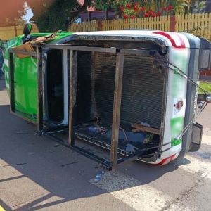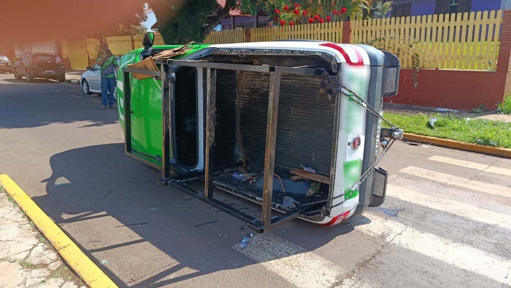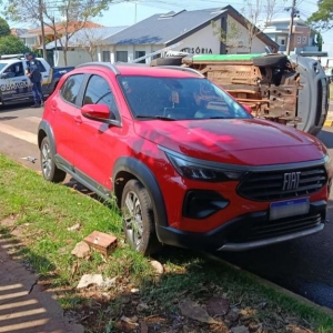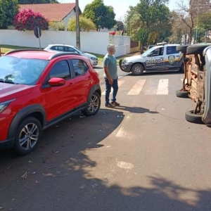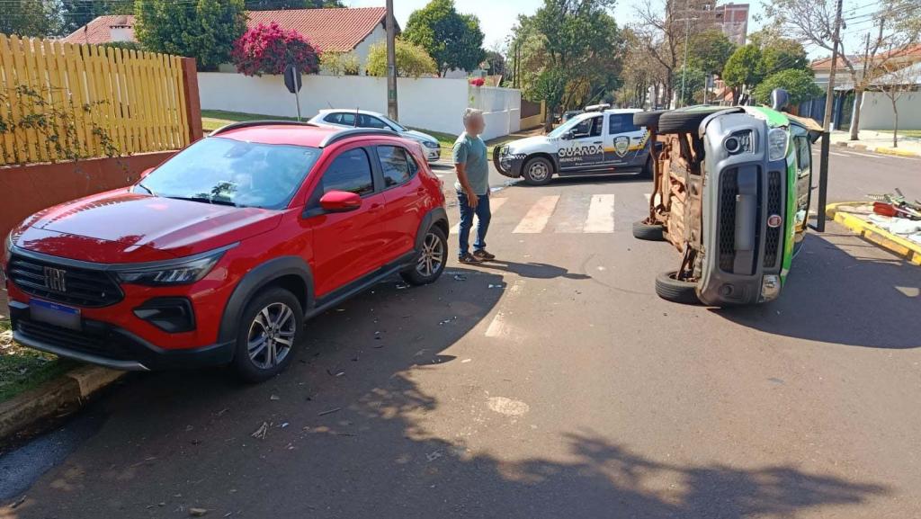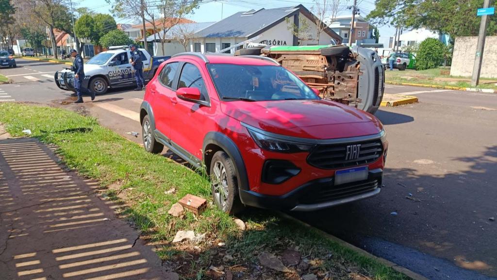 Um acidente do tipo colisão contra veículo estacionado seguido de tombamento foi registrado nesta quinta-feira (21) na Rua Guarani, no bairro Jardim La Salle, em Toledo.