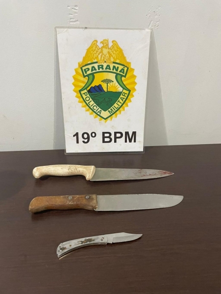 Foi atendido pela equipe médica de plantão do mini hospital. Com o autor, foram encontradas duas facas, de aproximadamente 20 centímetros de lâmina, sendo que uma delas estava suja de sangue. Também, em seu bolso, mais um canivete de 7 centímetros de lâmina.
