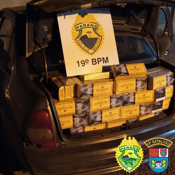 No local foi localizado um Corsa Wind, estacionado e aberto, sendo constatado que o mesmo estava carregado no bagageiro e no interior com diversos maços soltos de cigarros de origem paraguaia.