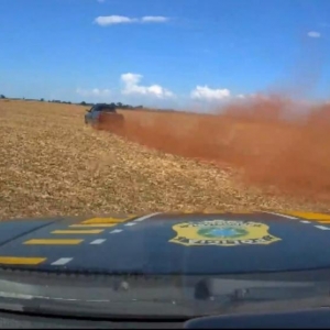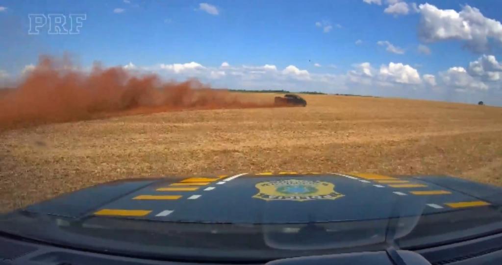 Após se dar conta de que não conseguiria se desvencilhar dos policiais rodoviários federais, o contrabandista atravessou uma área de plantação recém-colhida, onde fez outras manobras em zigue-zague, em mais uma tentativa de provocar danos à viatura da PRF e escapar do acompanhamento.