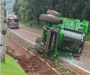 O maquinário agrícola apresentou problemas mecânicos em uma descida e o operador não conseguiu controlar a colheitadeira que tombou ficando de lado na pista.
