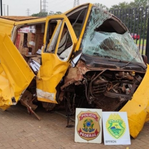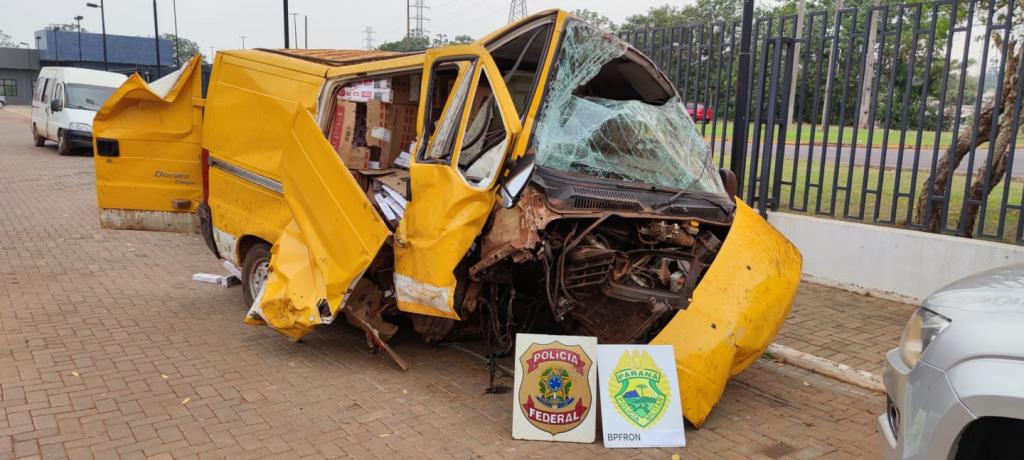 Porém, para fugir da fiscalização o motorista seguiu em direção a uma lavoura, no entanto, colidiu em um anteparo do tipo tronco de árvore, causando acidente de elevada monta. Em vistoria ao veículo, foi constatado que estava carregado com 150 caixas de cigarros.