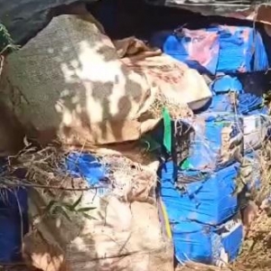A droga estava oculta sob lonas e galhos, numa tentativa de ludibriar as autoridades e dificultar sua localização.