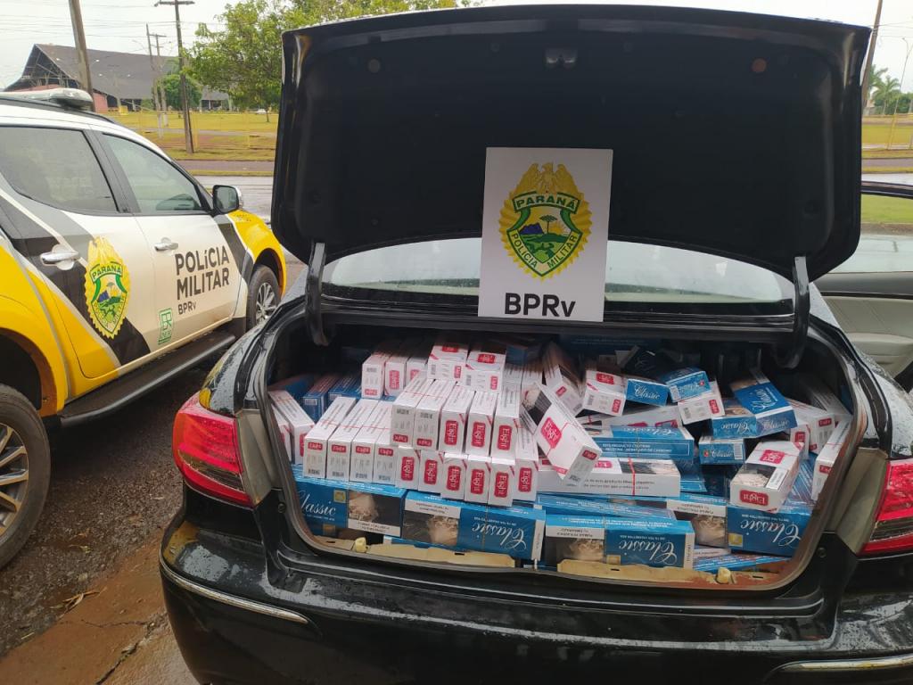 Ao revistar o porta malas, constataram que estava carregado com pacotes de cigarro de origem estrangeira, que após contados totalizaram 500 pacotes.