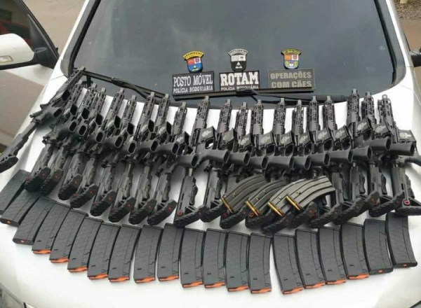 Com ajuda de um cachorro, foi localizado o fundo falso no porta malas, que continha 20 fuzis M4 556, 24 carregadores e 100 munições calibre 556.