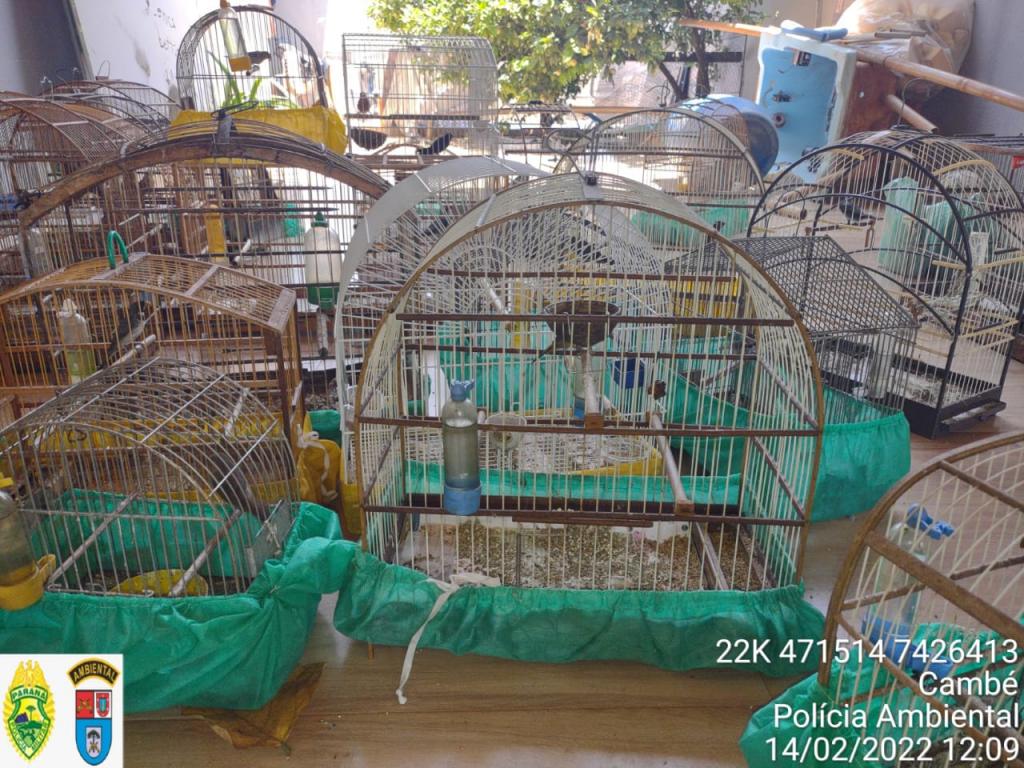 No Município de Cambé, nesta segunda-feira, Policiais Militares Ambientais em atendimento á denúncia constataram que 43 pássaros silvestres sem autorização foram localizados e durante a ação foram apreendidos cinco rifles calibre 22, um revólver calibre 22 e 472 munições calibre 22 de forma irregular.