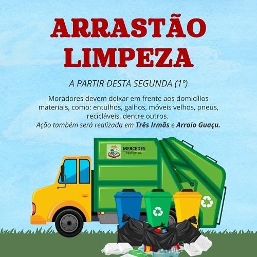 A Prefeitura de Mercedes realiza a partir da próxima segunda-feira (1º) mais um Arrastão da Limpeza, na cidade e nos distritos de Arroio Guaçu e Três Irmãs. Os moradores devem deixar em frente aos domicílios materiais, como: entulhos, galhos, móveis velhos, pneus, recicláveis, dentre outros.