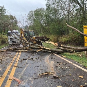Uma enorme árvore caiu, provavelmente com a força dos ventos na manhã deste sábado em Nova Santa Rosa, na rodovia PR 491 que liga a cidade ao município de Maripá, proximidades do Frigorífico Frigorosa.