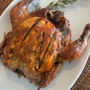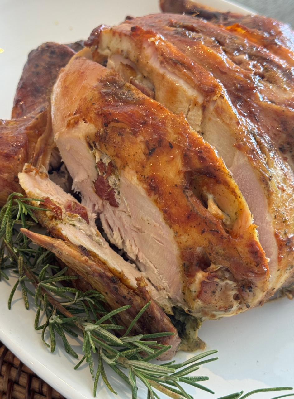 - Frango Assado Sem Recheio e com cubos de bacon (acompanha batata assada e farofa);