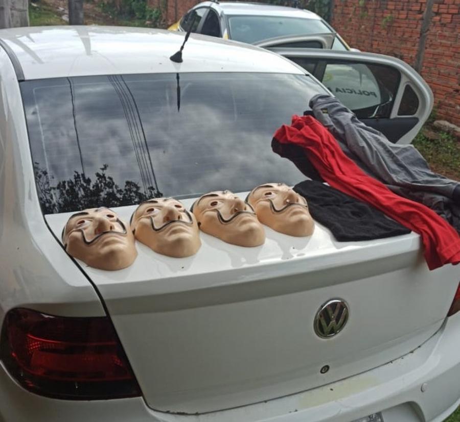 Dentro do carro, os policiais informaram que foram apreendidas as máscaras e roupas dos personagens, usadas pelos suspeitos no crime.