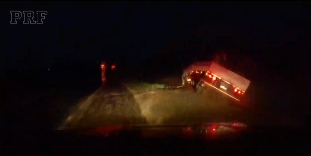 Sob chuva, agentes da PRF deram ordem de parada ao motorista, que transitava pela BR-163, por volta das 5 horas da madrugada. O caminhoneiro reduziu a velocidade, mas logo em seguida acelerou, em fuga.