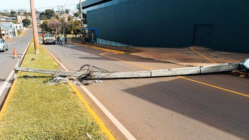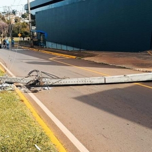 Inicialmente, o poste havia quebrado na base, mas permaneceu erguido. No entanto, por volta das 9h50, conforme relatado pela Guarda Municipal, que prestava atendimento à ocorrência, a estrutura acabou caindo e ficou atravessada no meio da pista.