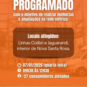 A Copel informa que haverá desligamento programado de energia elétrica em Nova Santa Rosa nesta quarta-feira (7), no período das 9h30 às 12h30.