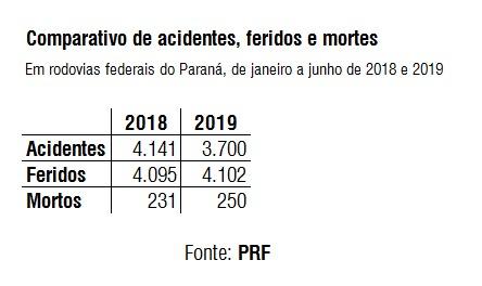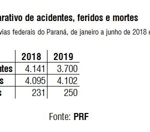 Entre janeiro e junho deste ano, a PRF registrou 250 mortes em acidentes de trânsito no estado. O número é 8,2% superior ao do mesmo período de 2018, quando 231 pessoas morreram. O total de vítimas feridas permaneceu praticamente estável –oscilou de 4.095 para 4.102. E o número de acidentes atendidos pelos policiais rodoviários federais caiu 10,6%, de 4,1 mil para 3,7 mil.