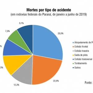 Os tipos de acidentes com maior letalidade foram atropelamentos (28% das vítimas mortas), colisões frontais (22,6%), colisões traseiras (12,3%), saídas de pista (11,5%), colisões transversais (9,5%) e tombamentos (7%).