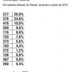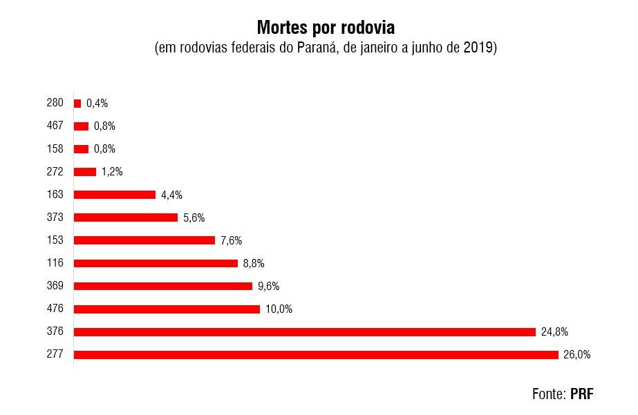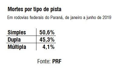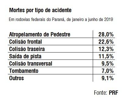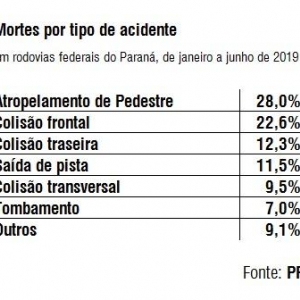 Metade das mortes registradas nas rodovias federais do Paraná durante o primeiro semestre de 2019 ocorreu em atropelamentos ou em colisões frontais. A informação é da Polícia Rodoviária Federal (PRF), que divulgou o balanço semestral de acidentes na manhã desta terça-feira (9).
