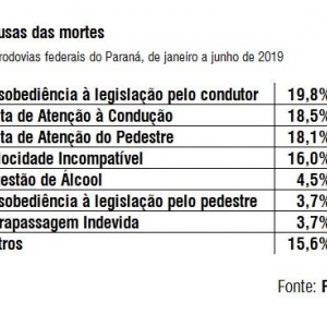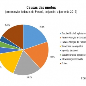 Desobediência às normas de trânsito, desatenção, excesso de velocidade, ingestão de bebidas alcoólicas e ultrapassagens malsucedidas foram as principais causas dos acidentes fatais, nessa ordem.