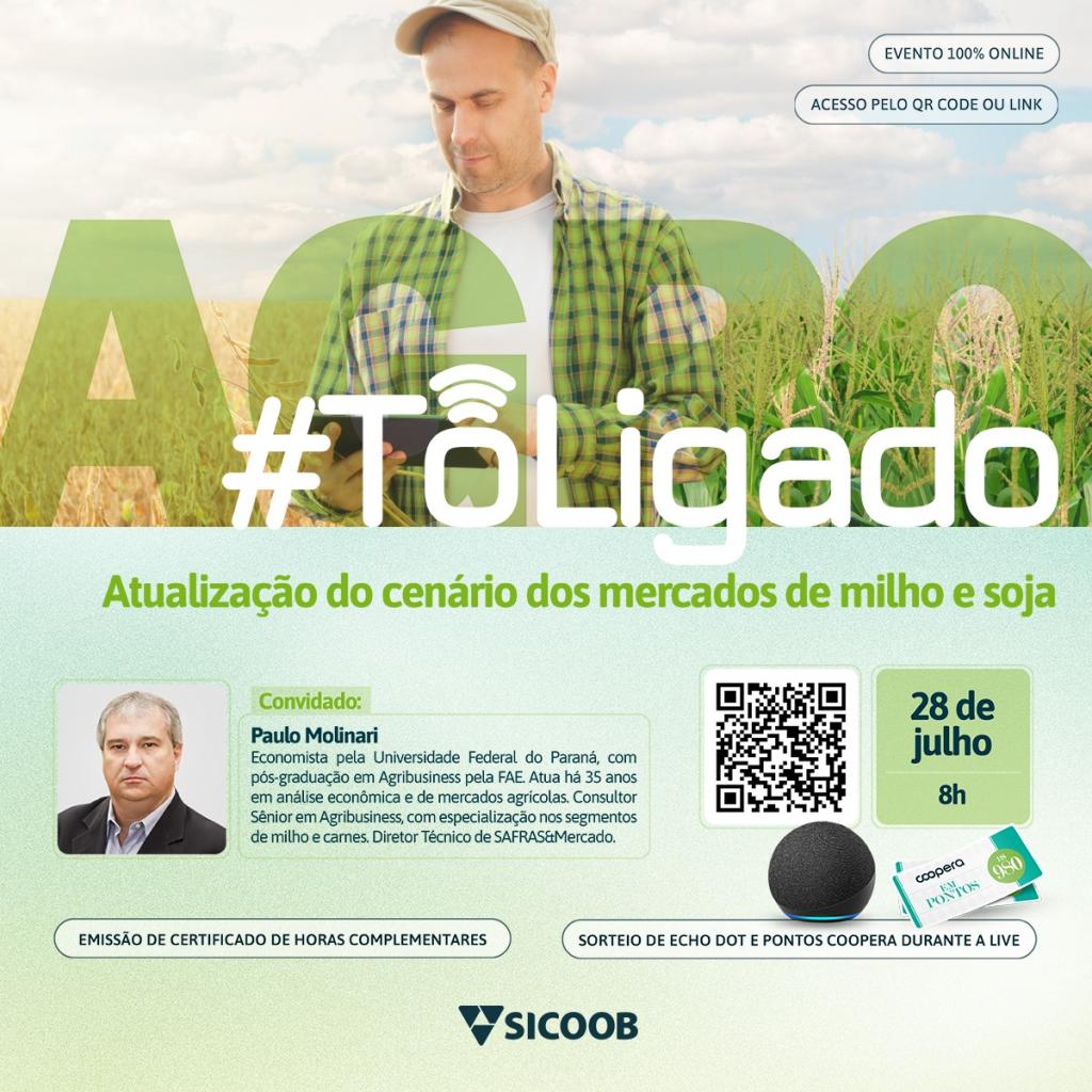 Por isso, no próximo dia 28/07, às 8h, irá disponibilizar a cooperados e comunidade em geral uma palestra online e gratuita com o economista e consultor sênior em agribusiness Paulo Molinari para falar sobre o cenário atual e futuro do milho e da soja.
