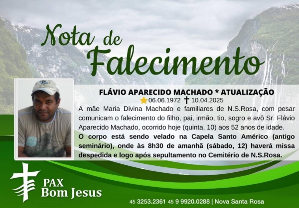 A mãe Maria Divina Machado e familiares de Nova Santa Rosa, com pesar comunicam o falecimento do filho, pai, irmão, tio, sogro e avô Sr. Flávio Aparecido Machado, ocorrido na quinta-feira (10) aos 52 anos de idade.