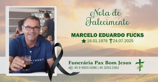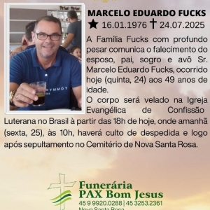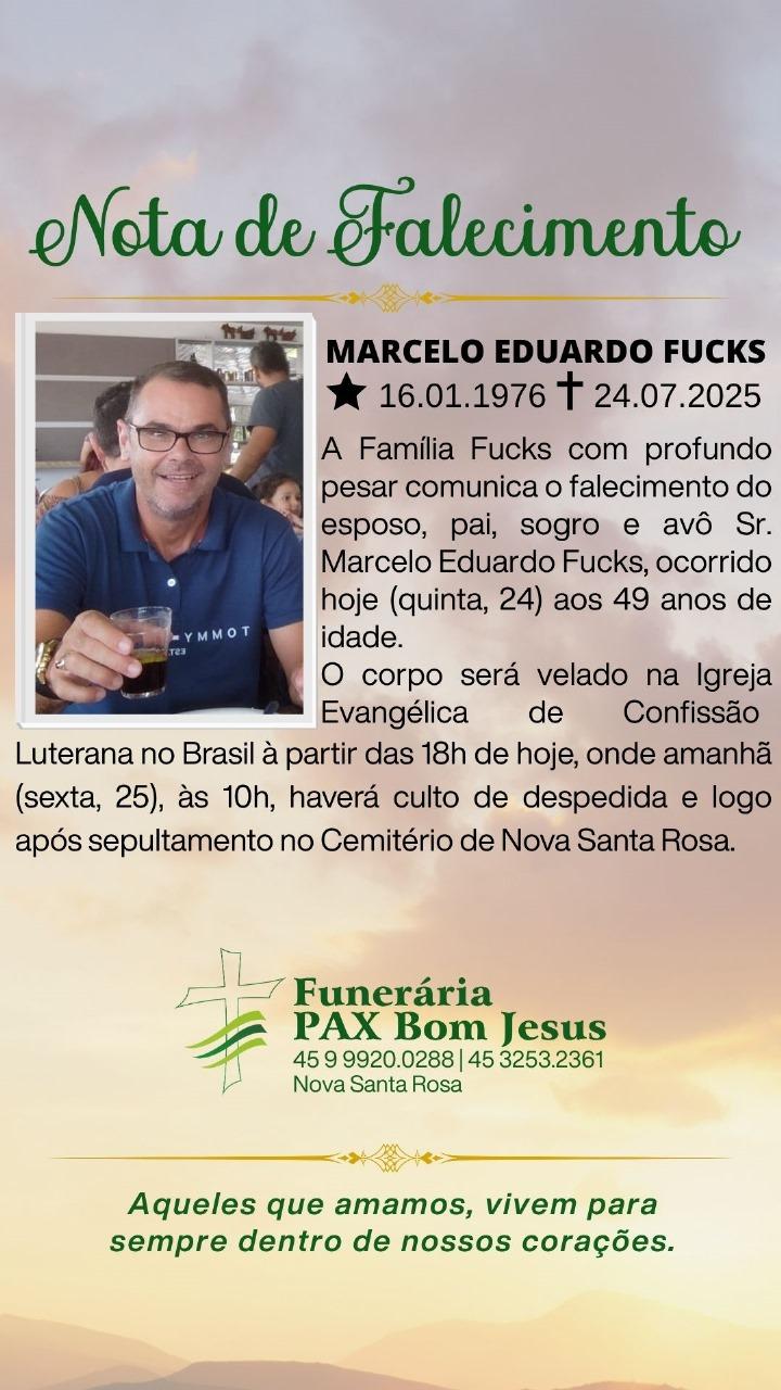 A Família Fucks com profundo pesar comunica o falecimento do esposo, pai, sogro e avô Sr. Marcelo Eduardo Fucks, ocorrido hoje (quinta, 24) aos 49 anos de idade.
