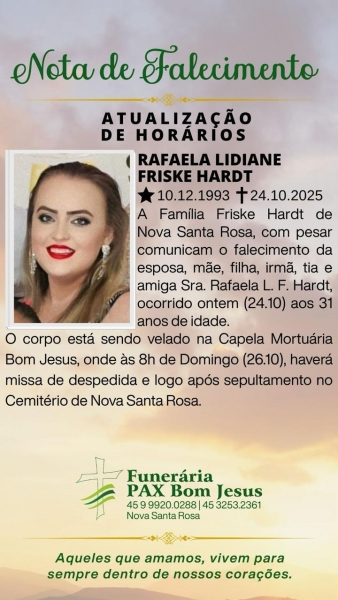 A Família Friske Hardt de Nova Santa Rosa, com pesar comunicam o falecimento da esposa, mãe, filha, irmã, tia e amiga Sra. Rafaela L. F. Hardt, ocorrido sexta-feira (24) aos 31 anos de idade.