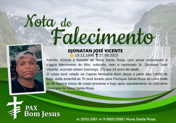 Família Vicente e Kessler de Nova Santa Rosa, com pesar comunicam o trágico falecimento do filho, sobrinho, neto e namorado Sr. Djonatan José Vicente, ocorrido ontem (domingo, 27) aos 24 anos de idade.